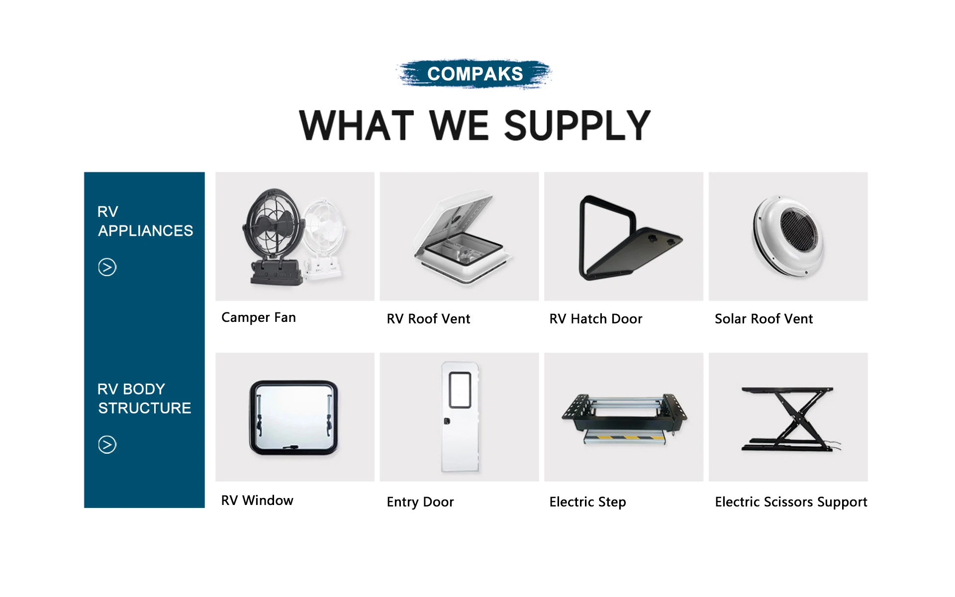 Ana ürünler:RV parçaları, kamp römorku, kamp römorku mutfak, RV çadır, RV modülü ürünleri